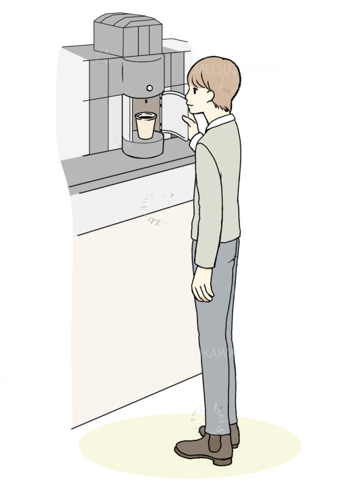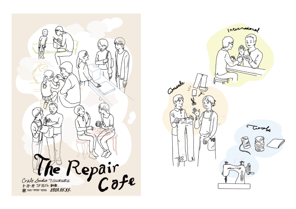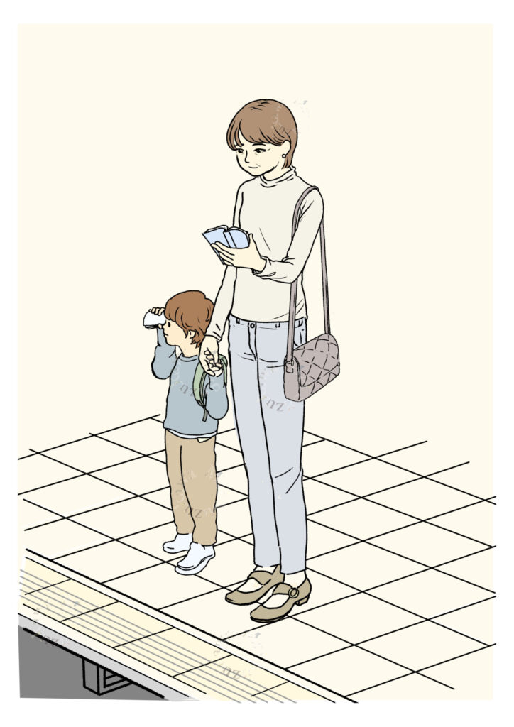 孫を迎えに行った帰りの駅のホームで電車を待つスキマ時間に勉強する女性。勉強することの世代の制限がないこととポケット本なので持ち歩きやすいことをイラストでアピールできる。