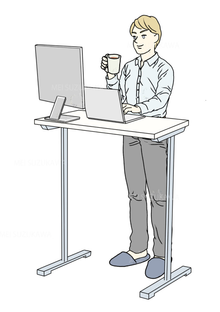 リモートワークでスタンディングデスクで余裕をもって働く外国人男性